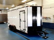 ♦ Spread Axle ♦ Blackout Package ♦ Rear Spoiler w/ Load Lights ♦ Wide Side Door ♦ Walk-On Roof ♦ 5 Ladder Racks ♦ Semi-Screwless .080 PolyCor Siding ♦ 12' of Recessed E-Track Welded Into Wall ♦ 60" Triple Tube Tongue w/ Adjustable Coupler ♦ Porch Light ♦ 16" O/C, 3/4" Floor & 3/8" Walls ♦ Recessed 5K D-Rings ♦
